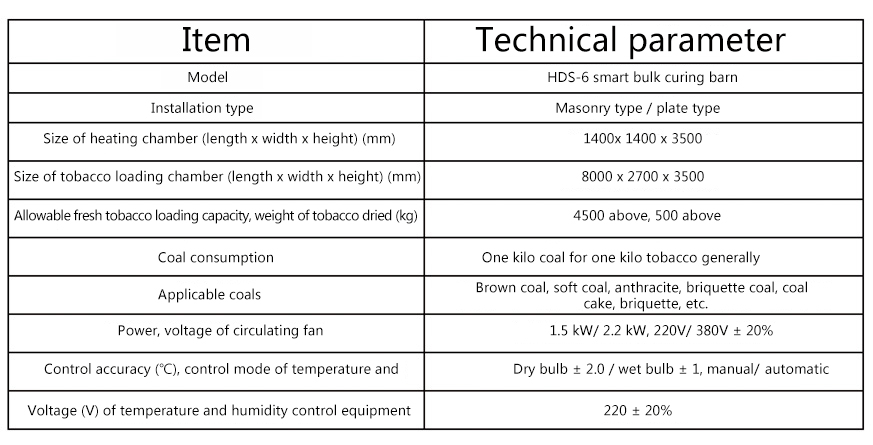 HDS-6 smart bulk curing barn includes a microcomputer controller. The whole tobacco baking process is completed through the automatic program. The equipment has features of automatic coal feeding, automatic moisture elimination and automatic voice alarm, etc. The tobacco baked by the equipment has bright color although it becomes yellow. The tobacco quality of tobacco leaf is improved remarkably. In addition to baking of tobacco, this equipment can be also used to bake traditional Chinese medicines, grains, mushrooms, vegetables, fruits and marine products, etc., greatly improving the utilization rate of curing barn.